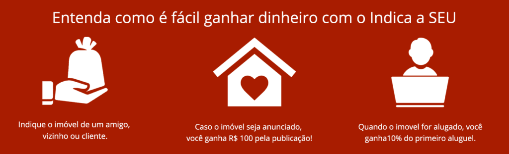 Para indicar, acesse o site da Seu imóvel ou entre em contato por nossos canais de atendimento e informe o nome e contato do proprietário, quanto mais informações, maior a possibilidade do contato ser efetivado e você ganhar seu dinheiro extra.
